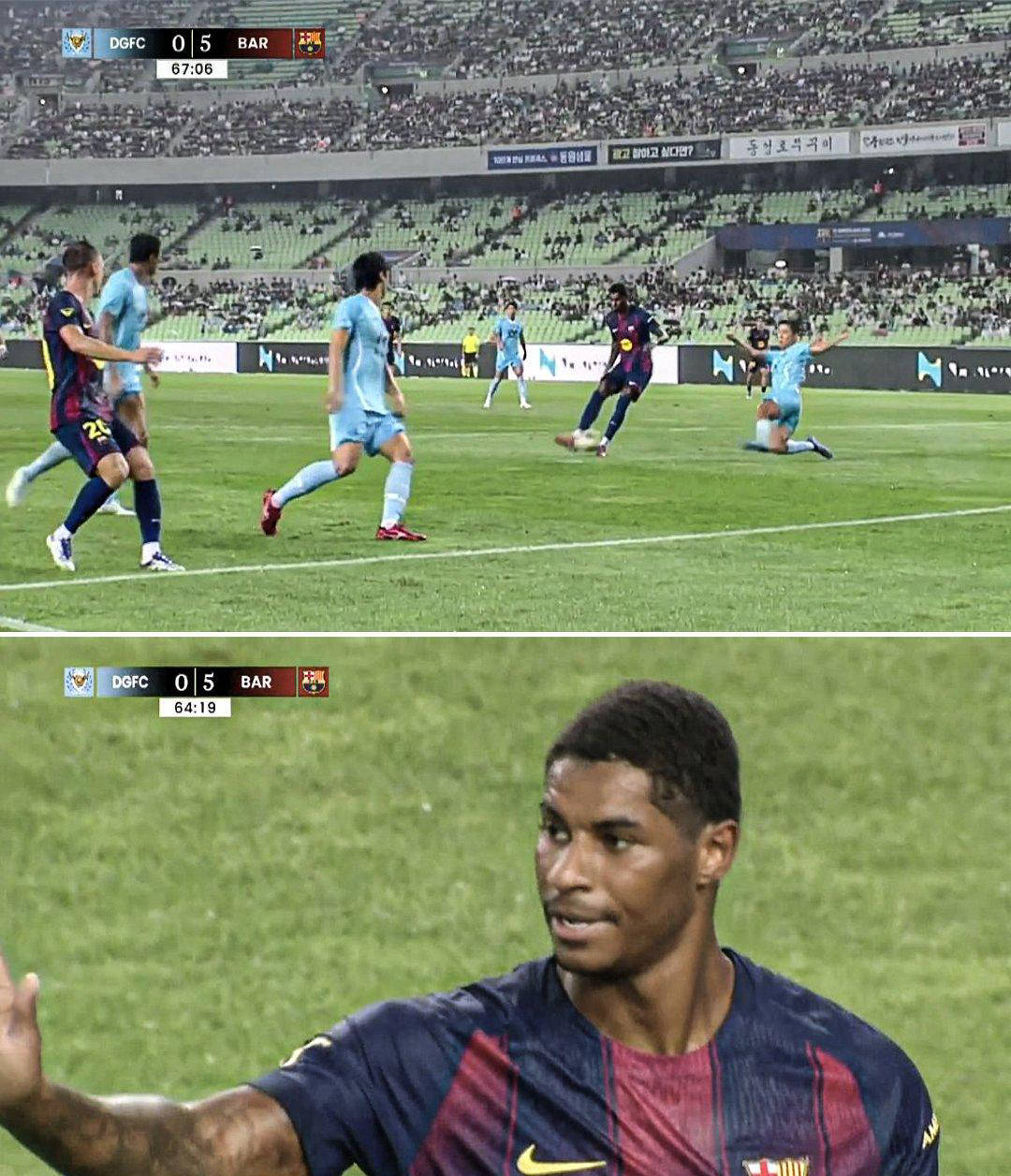 在巴萨5-0大胜韩国大邱的比赛中,拉什福德打入了自己转会后的第一球。作为曼联租借至巴萨的球员,拉什福德在该场比赛中是替补身份。上半场,加维和莱万多夫斯基的进球让巴萨以3-0领先,而下半场出场的拉什福德则锦上添花,完成入球。